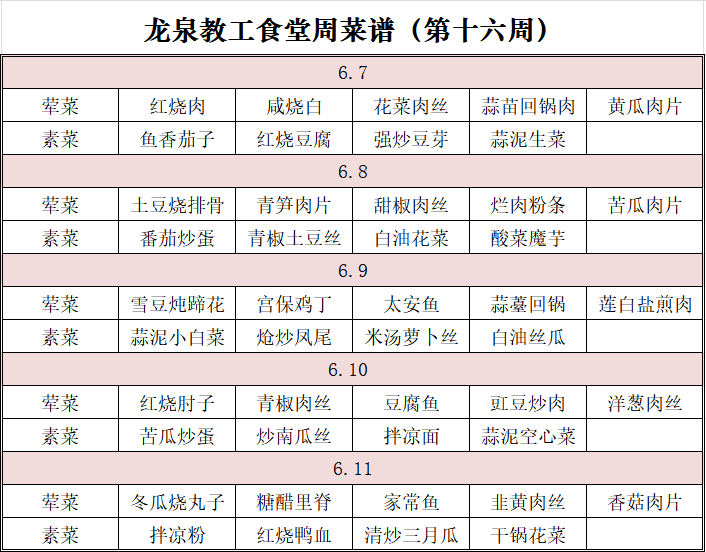 欢迎各位教职工查阅两校区教工食堂第十六周菜谱并提出宝贵意见建议。