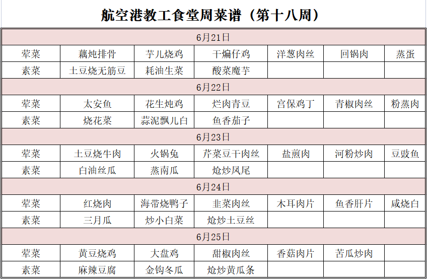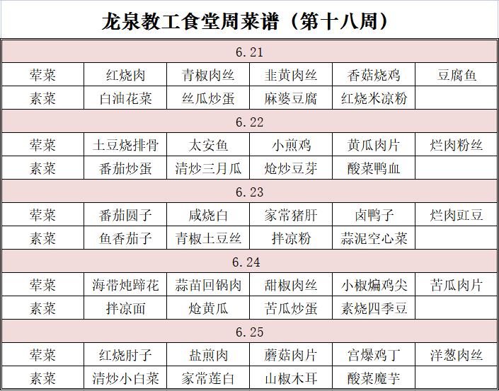 欢迎各位教职工查阅两校区教工食堂第十八周菜谱并提出宝贵意见建议。