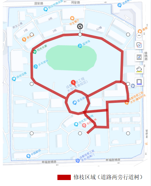 4.2 按照成都市园林绿化树木修剪整形操作指南和行业相关技术规范以及采购人现场具体要求,对乔木进行全面整形修剪,采用机器修枝与人工修枝结合方式进行施工。要求乔木树冠通透敞亮,在改善采光、通风条件的同时,保证尽空3.5米以上,同时满足大型车辆通行。
