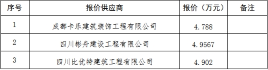本次竞价响应单位共计叁家。本项目按照满足要求且最低价成交的原则确定最终供应商为:成都卡乐建筑装饰工程有限公司。如有异议,请于本通知发布次日内以书面形式反馈至我部门,过时视为认同。