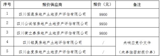 本次竞价响应单位共计伍家。本项目按照满足要求且最低价成交的原则确定最终供应商为:四川衡立泰房地产土地资产评估有限公司。如有异议,请于本通知发布次日内以书面形式反馈至我部门,过时视为认同。