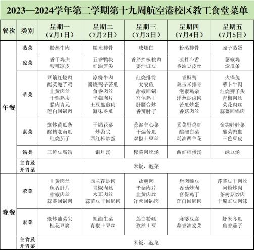 以下是2023—2024学年第二学期第十九周(2024年7月1日至5日)航空港校区教工食堂菜单,期待您提出宝贵的意见和建议,祝大家用餐愉快!