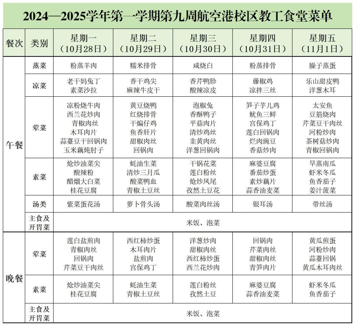 以下是2024—2025学年第一学期第九周(2024年10月28日至11月1日)航空港校区教工食堂菜单,期待您提出宝贵的意见和建议,祝大家用餐愉快!