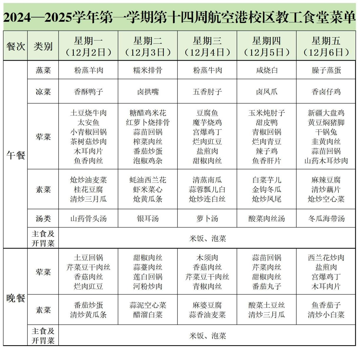 以下是2024—2025学年第一学期第十四周(2024年12月2日至12月6日)航空港校区教工食堂菜单,期待您提出宝贵的意见和建议,祝大家用餐愉快!