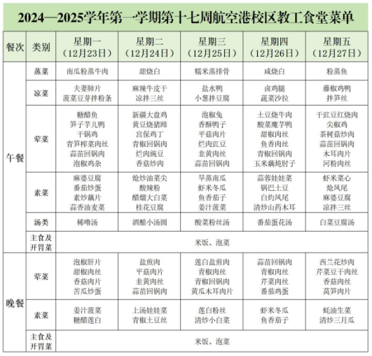 以下是2024—2025学年第一学期第十七周(2024年12月23日至12月27日)航空港校区教工食堂菜单,期待您提出宝贵的意见和建议,祝大家用餐愉快!