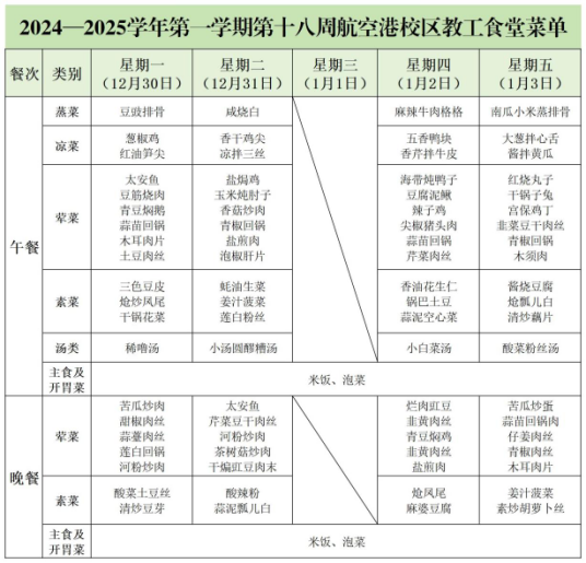 以下是2024—2025学年第一学期第十八周(2024年12月30日至2025年1月3日)航空港校区教工食堂菜单,期待您提出宝贵的意见和建议,祝大家用餐愉快!