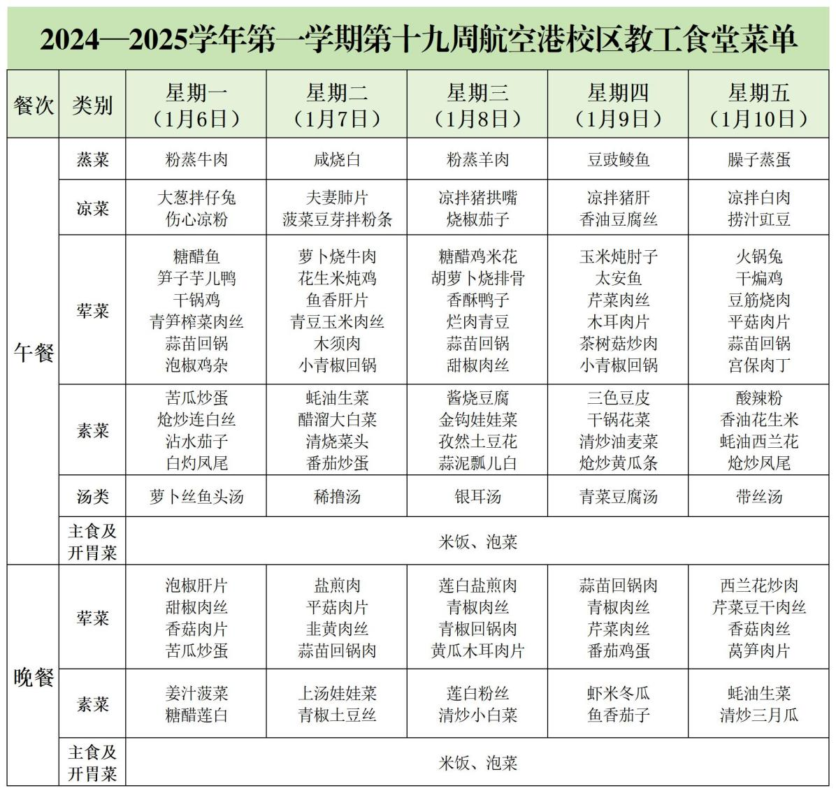 以下是2024—2025学年第一学期第十九周(2025年1月6日至2025年1月10日)航空港校区教工食堂菜单,期待您提出宝贵的意见和建议,祝大家用餐愉快!