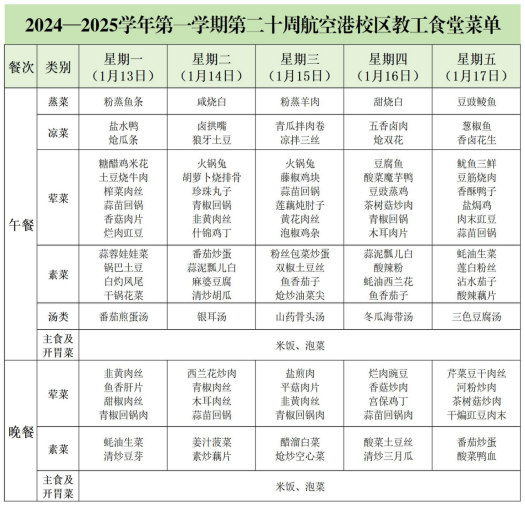 以下是2024—2025学年第一学期第二十周(2025年1月13日至2025年1月17日)航空港校区教工食堂菜单,期待您提出宝贵的意见和建议,祝大家用餐愉快!