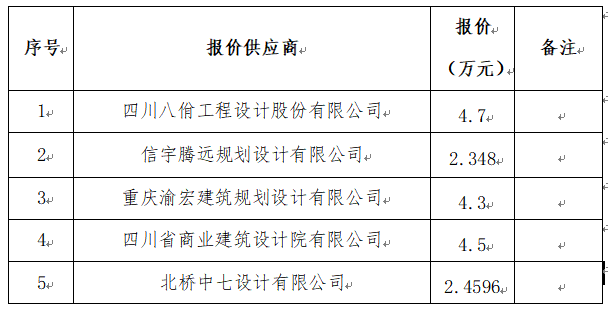 本次竞价共有叁家供应商递交资料,本项目按照满足要求且报价最低原则确定供应商家为:信宇腾远规划设计有限公司。如有异议,请于本通知发布次日内以书面形式反馈至我部门,过时视为认同。