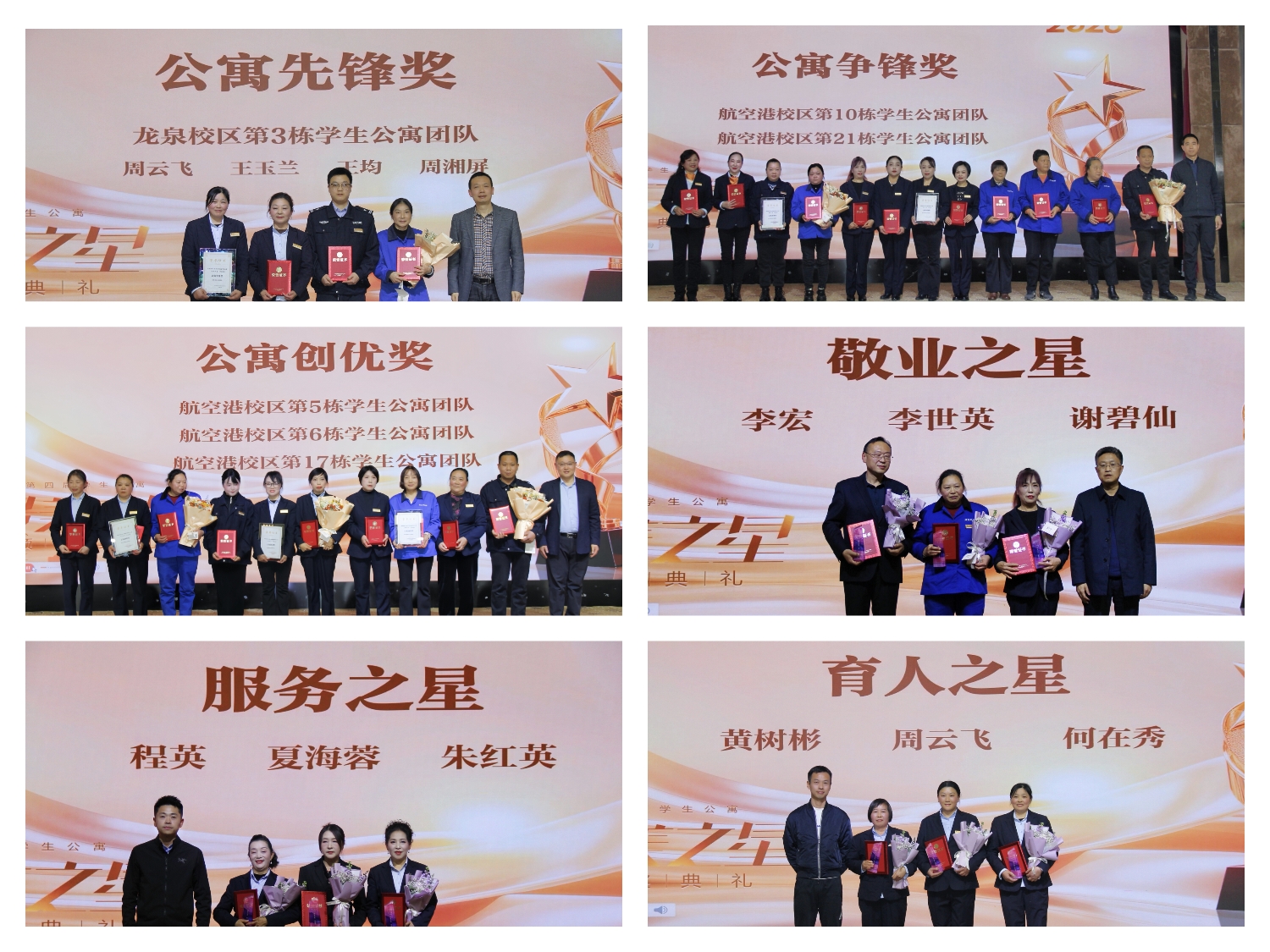 杨奇才和参会部门负责人代表为敬业之星、服务之星、育人之星等9名优秀个人,公寓创优奖、公寓争锋奖、公寓先锋奖等6个优秀集体颁发荣誉证书和奖杯,学生代表献上了鲜花,向坚守公寓老师们致以敬意。