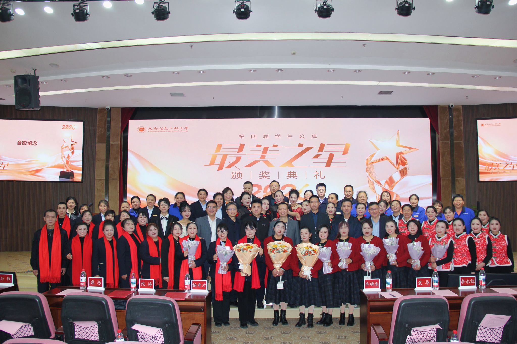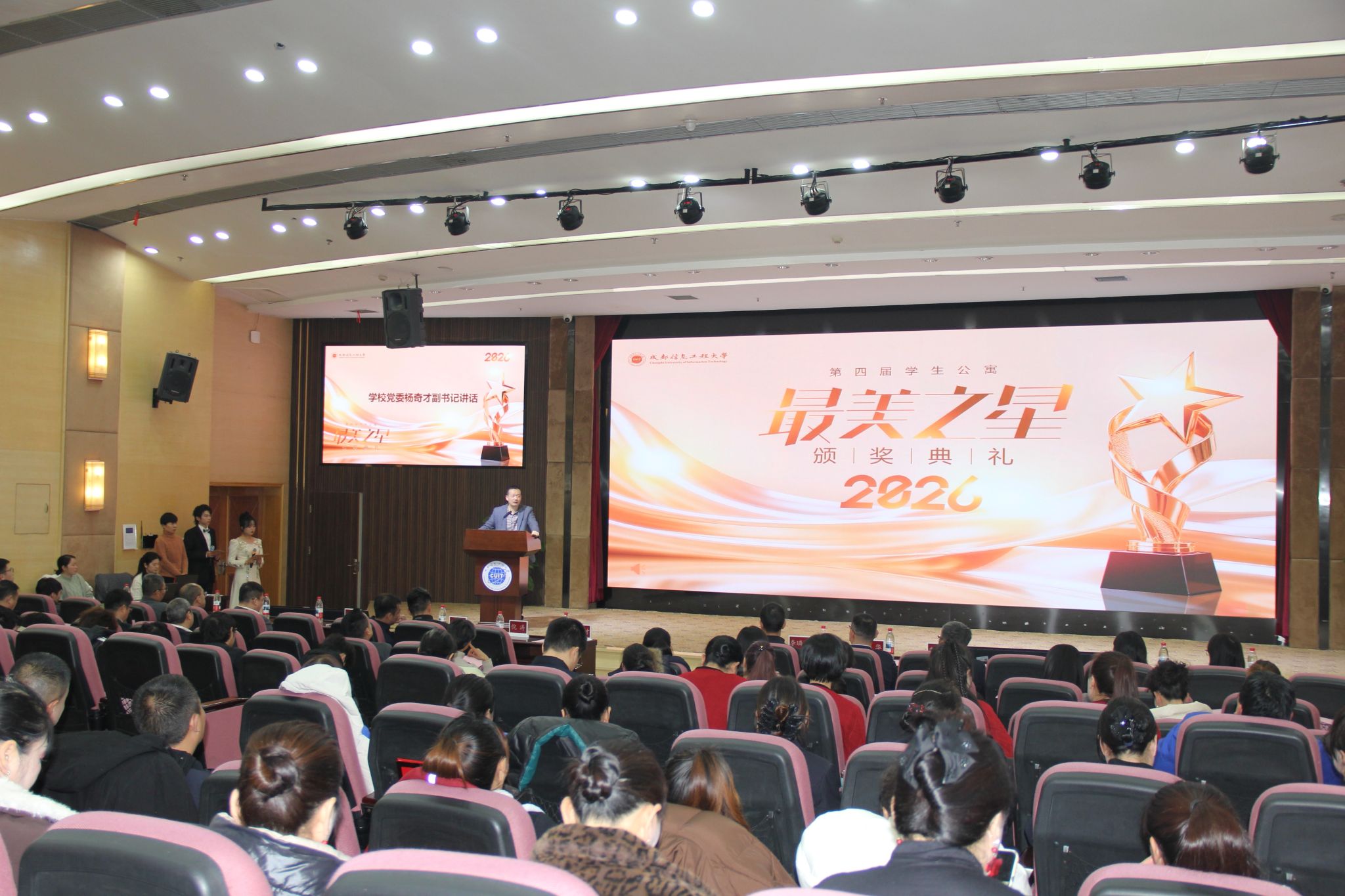 1月14日下午,成都信息工程大学第四届学生公寓 “最美之星” 颁奖典礼在航空港校区国际会议厅圆满落幕。学校党委副书记杨奇才出席典礼并讲话,党委宣传部、党委学生工作部、后勤基建处等部门负责人,以及后勤员工代表、学生代表共 100 余人参会。