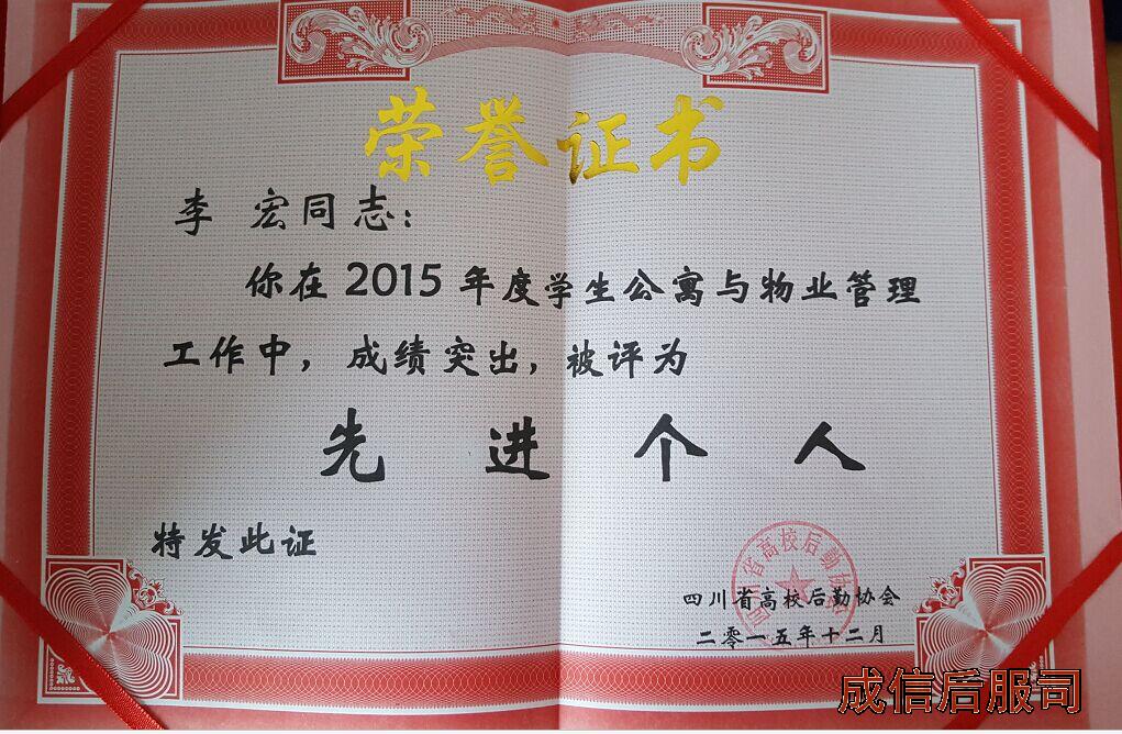 协会对2015年度先进集体及个人进行了表彰。公司学生公寓管理中心荣获2015年度四川省高校学生公寓管理与物业管理工作“先进集体”称号,杨建功、李宏同志获2015年四川省学生公寓管理与物业管理工作“先进个人”称号。