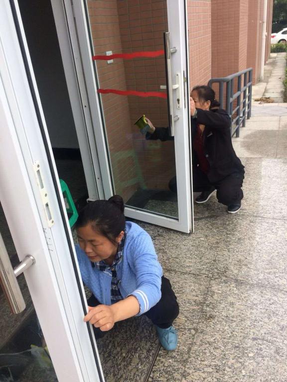 4月20日,航空港校区保洁部在新教学楼对新进员工进行刮玻璃培训,由部长张蓉进行讲解并演示。