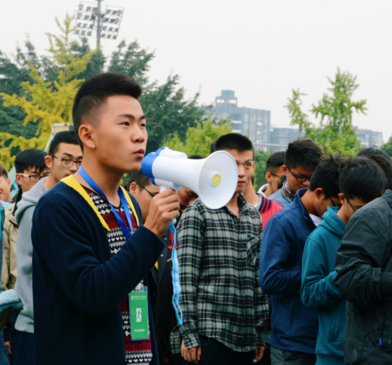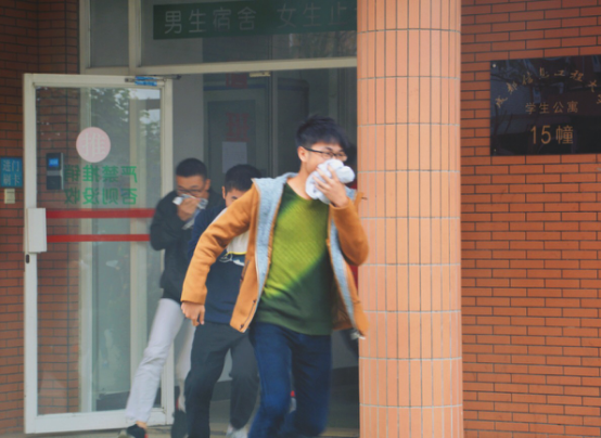 在总导演宣布“演练开始,点燃烟饼”后,疏导员在获得火灾信息后迅速打开所有通道,赶往火灾现场查看火情与组织灭火,并报告现场情况。全体参演同学听到火灾信号后迅速切断室内电源,关好门窗,用湿毛巾捂住口鼻选择最佳路径有序跑出楼宇,最后安全到达指定集合位置。