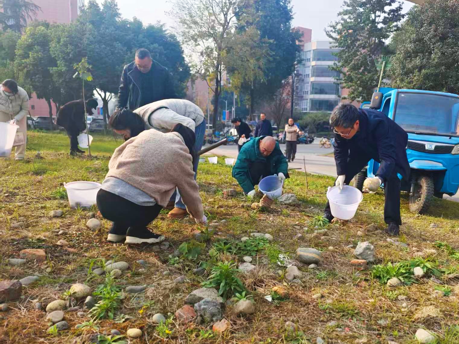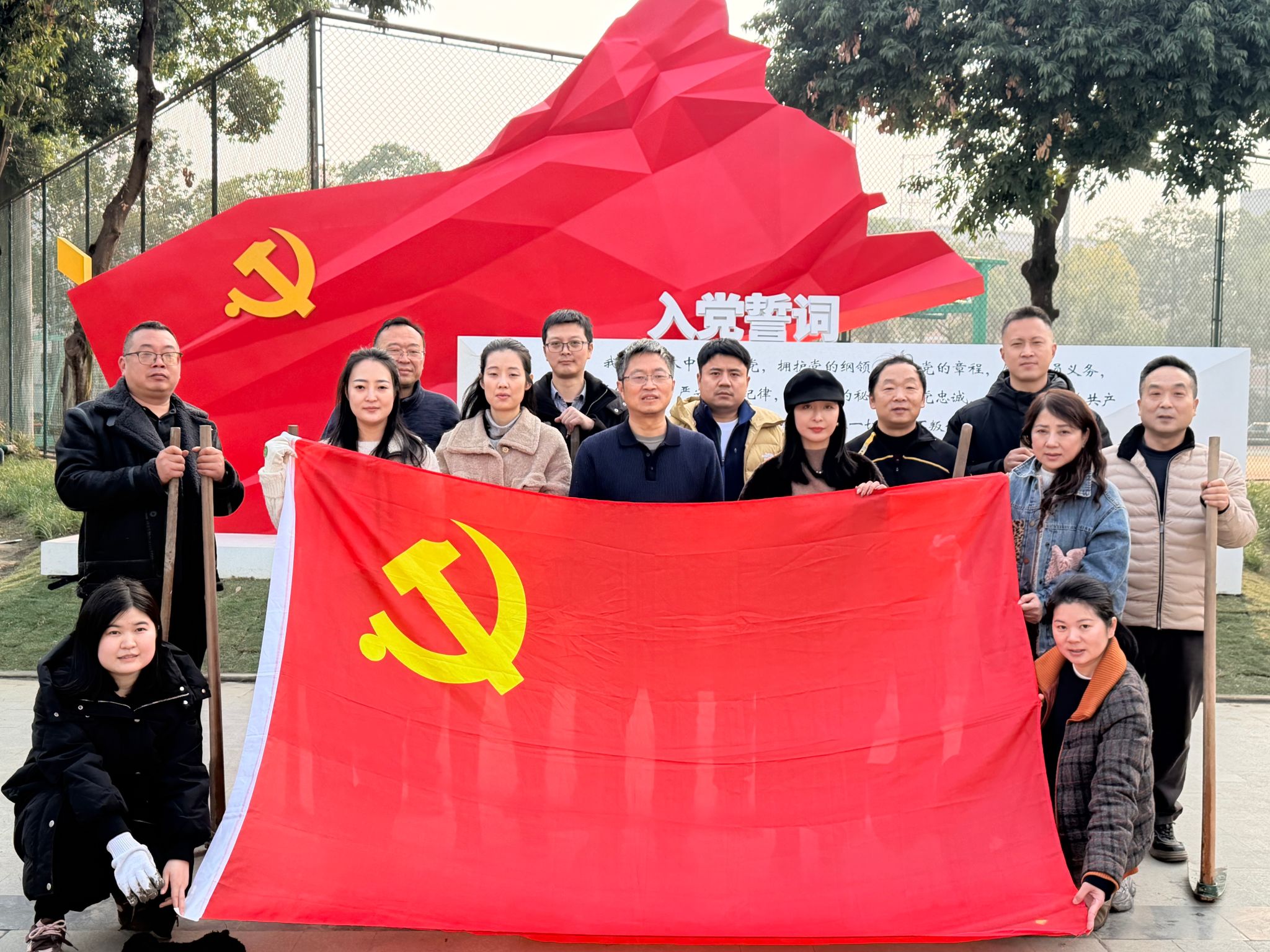 为积极响应学校党建品牌创建与校园文化提升工程部署,助力学校党建品牌建设走深走实,2025年12月16日下午,后勤基建党委第二、第三支部组织全体党员,在学校新建党建雕塑所在的莲园党旗周边区域,联合开展了“党建引领聚合力,共建品牌添新彩”主题党日活动。活动以美化校园环境为载体,旨在推动党建工作与校园文化建设相融合,展现基层党支部在学校整体党建布局中的担当与作为。